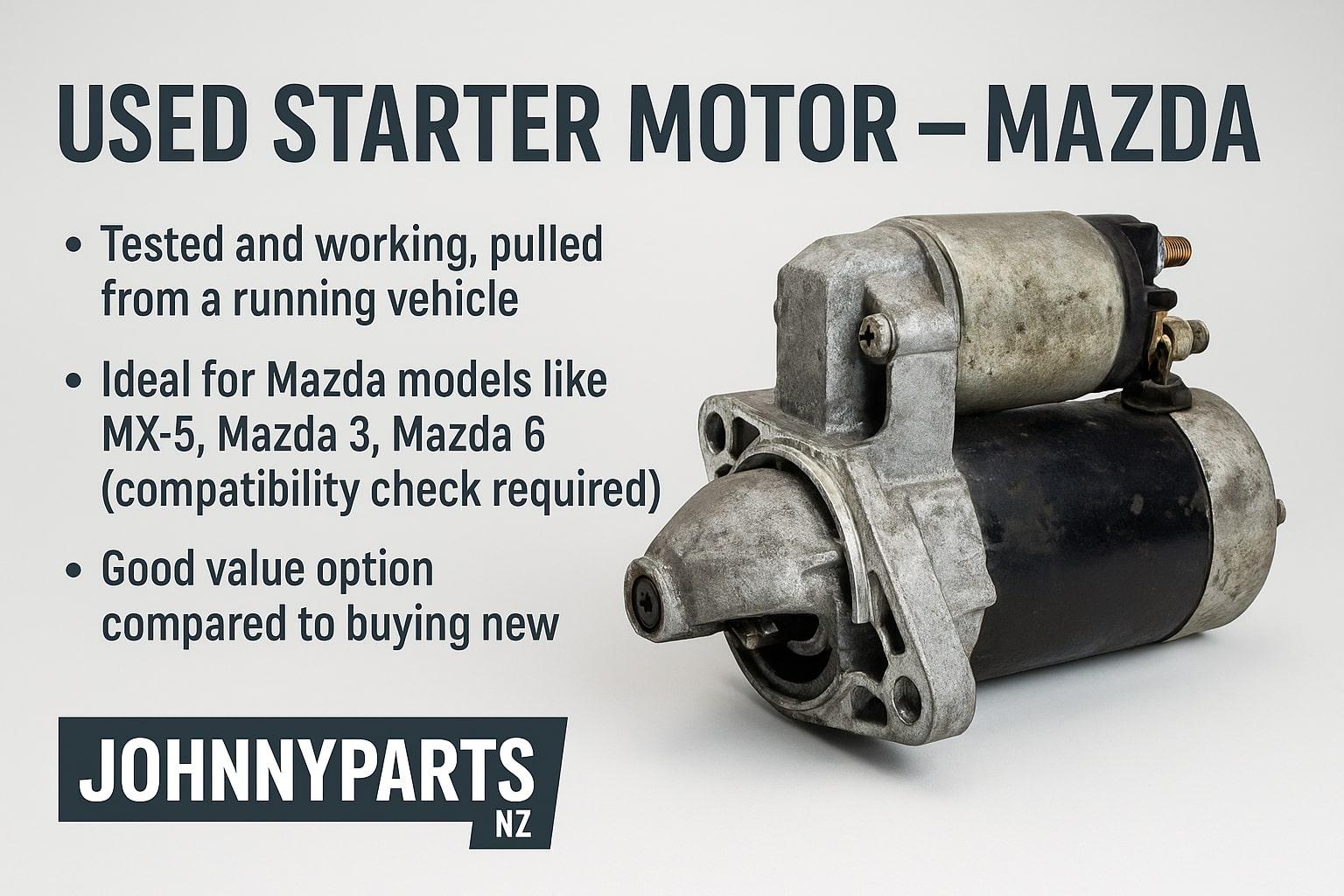 Hey folks – John here from JohnnyParts NZ. Got a handy bit of gear for sale: one used starter motor for a Mazda. Perfect for cars that refuse to turn over and need a cost-effective fix.
